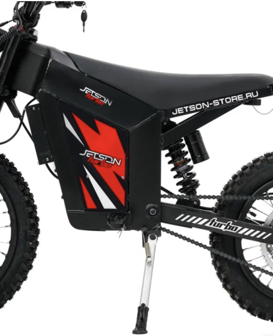 Jetson TURBO 1500W — мощный внедорожный электропитбайк с аккумулятором 26Ah (60V). Запас хода до 70 км, максимальная скорость 65 км/ч. Оснащён алюминиевой рамой, дисковыми гидравлическими тормозами, амортизацией и надувными шинами.