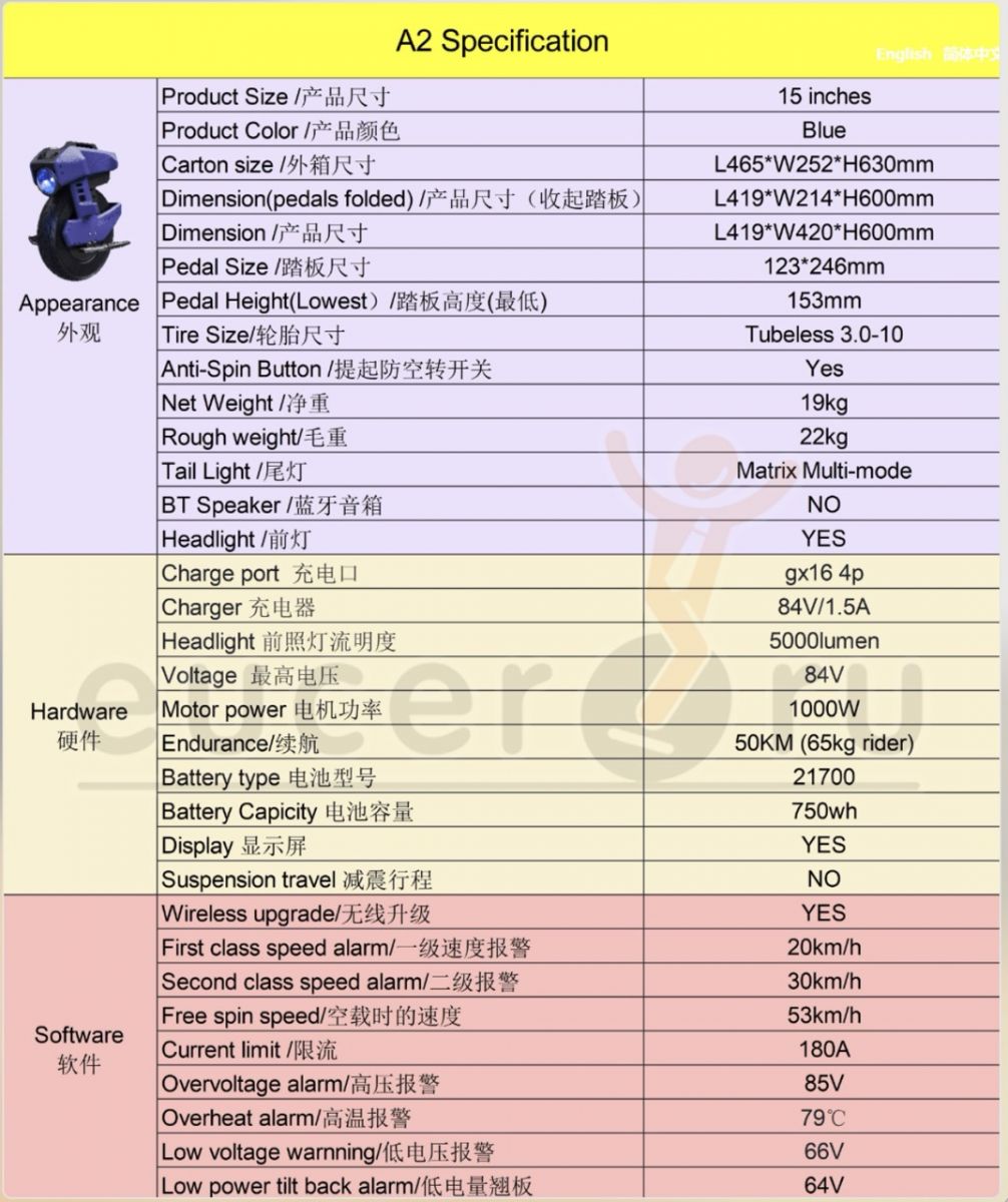 Коротко: 15-дюймовое моноколесо с батареей 750Wh (84V) и мотором 1000W HT. Лёгкое (19 кг нетто), яркая фара 5000 лм, задний матричный габарит, анти-спин кнопка, покрышка 3.0-10 tubeless. Реальный пробег до 50 км(райдер ~65 кг), комфортная скорость городского потока 30–35 км/ч (без нагрузки до 53 км/ч).